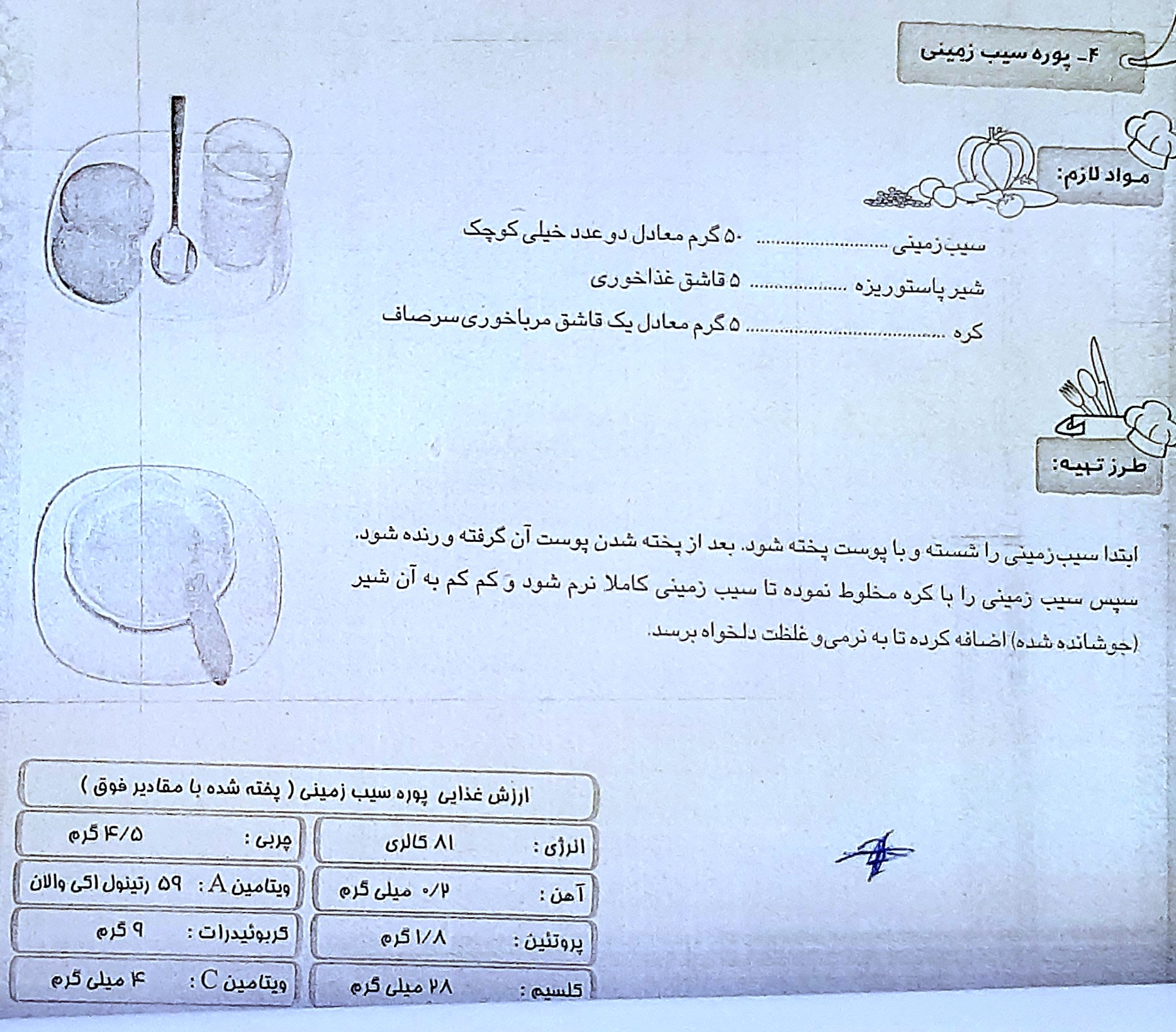 ❌ اگر 1 قاشق مرباخوری کره (5گرم) در اواخر پخت به دستور فوق اضافه شود انرژی آن حدود ۳۵ کالری بیشتر می شود . اضافه کردن کره یا روغن(زیتون) برای کودکانی که خوب وزن نمی گیرند توصیه می شود.