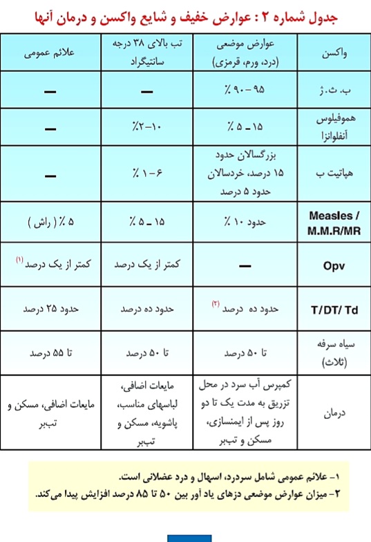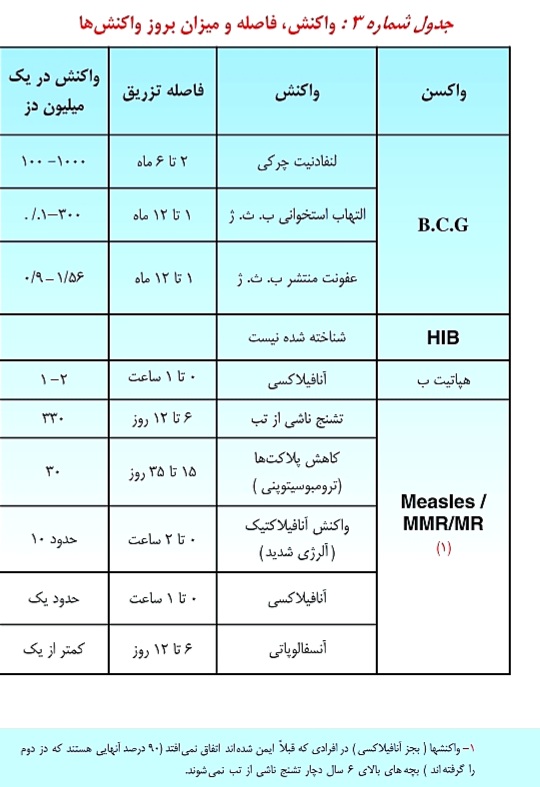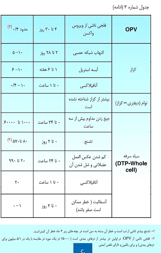 در جدول شماره ۳ صفحه ۵۹ شرح مفصلی از واکنشهای نادر واکسن ها ذکر شده است.