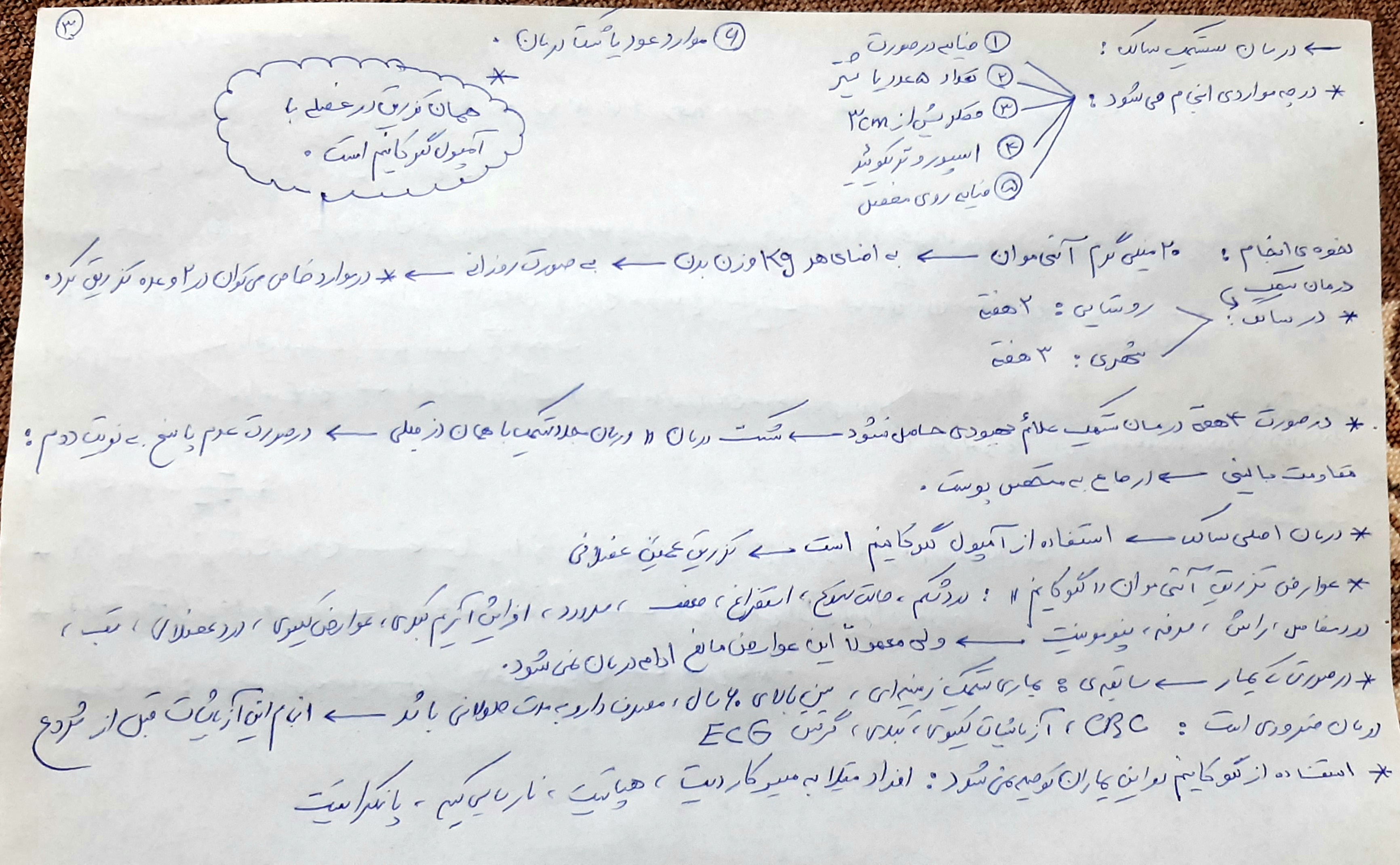 ➕۲۰ میلی گرم آنتیموان برای هر کیلوگرم وزن بدن روزانه و به مدت ۴ روز و عضلانی و یا وریدی.